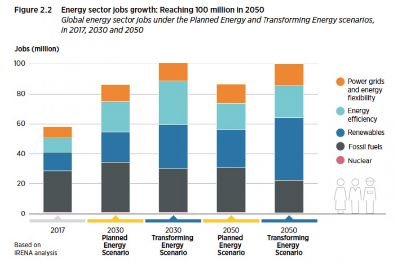 《展望》中揭示,盡管深入脫碳需要的能源投資總額高達 130 萬億美元,但其帶來的社會經濟收益也非常豐厚。 從現在到 2050 年,與目前的能源系統(tǒng)相比,能源系統(tǒng)轉型可以刺激全球 GDP 累計增加 98 萬億美元。 可再生能源相關工作崗位將增至約四倍, 達到 4,200 萬個,能源效率相關工作崗位增加到 2,100 萬個,系統(tǒng)靈活性相關工作崗位 增加到 1,500 萬個。